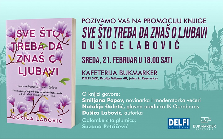 Roman „Sve što treba da znaš o ljubavi“ Dušice Labović biće predstavljen beogradskoj publici21. februara u Bukmarker kafeteriji knjižare Delfi SKC u 18.00 sati.
